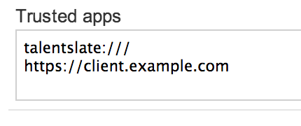 You can configure trusted apps by navigating to System Configuration in the Manage Center, and selecting the Security Management category. Configure each trusted app as a URL, which Talent Suite will compare with the redirect_uri provided by the app when it requests a token. We recommend configuring the full URL; however, the redirect_uri is considered to be trusted if the scheme, host and port match exactly, and the trusted app URL path is a prefix of the redirect_uri path.